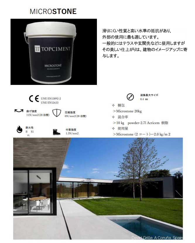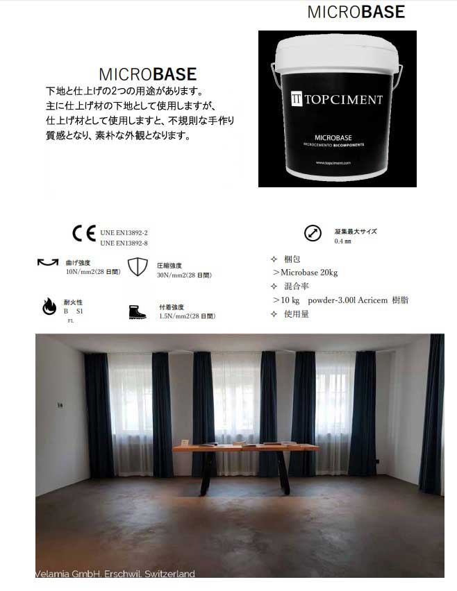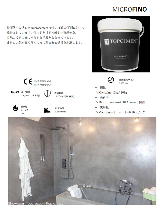 トップセメント社が製造するマイクロセメントは、セメント、水性樹脂、添加剤、および鉱物顔料をベースにした装飾用の複合コーティング素材です。